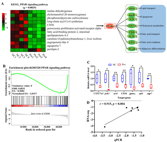 Changes in the PPAR signaling pathway in the intestines of C. carpio between the NC and Pro groups. (A) DEGs in the PPAR signaling pathway and possible mechanism regulating lipid metabolism. (B) GSEA for the PPAR signaling pathway. (C) Key genes expression in the PPARα signaling pathway measure by qPCR, with values expressed as the mean ± SEM (n = 4), * p < 0.05 and ** p < 0.01. (D) Correlation between the qPCR and RNA-seq data.