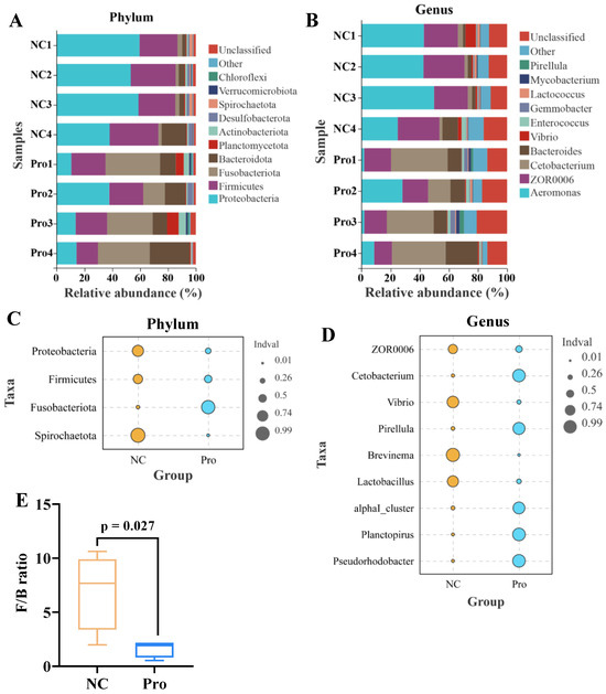 Indicator species analysis showed that Fusobacteriota has a higher relative abundance, while Proteobacteria, Firmicutes, and Spirochaetota exhibited lower relative abundance in the 0.8 g/kg Pro group, compared to the NC group (Figure 6C). Similarly, at the genus level, the relative abundance of Cetobacterium, Pirellula, alphaI_cluster, Planctopirus, and Pseudorhodobacter were higher, whereas the relative abundance of ZOR0006, Vibrio, Brevinema, and Lactobacillus were lower in the 0.8 g/kg Pro group, compared to the NC group (Figure 6D). Notably, the Firmicutes/Bacteroidetes (F/B) ratio showed a decrease in the 0.8 g/kg Pro group compared with the NC group (Figure 6E).