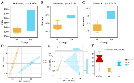 The α diversity (A–C) and β diversity (D–F) analysis of intestinal microbiota between the NC and Pro groups. (A) Chao1 index. (B) Simpson’s index of diversity. (C) Shannon index. (D) PCA score plot. (E) PCoA score plot. (F) Anosim test.