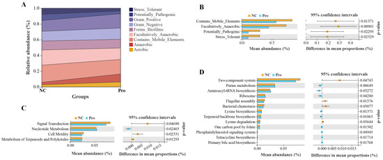 The analyses for potential phenotypes and functions of intestinal microbiota in the NC and Pro groups. (A) Relative abundance of nine potential phenotypes of intestinal microbiota. (B) Differential phenotypes of the intestinal microbiota between the NC and Pro groups. (C) Differential pathways at level 2 KEGG between the NC and Pro groups. (D) Differential pathways at level 3 KEGG between the NC and Pro groups. Statistical significance was identified by Welch’s t-test with p < 0.05.