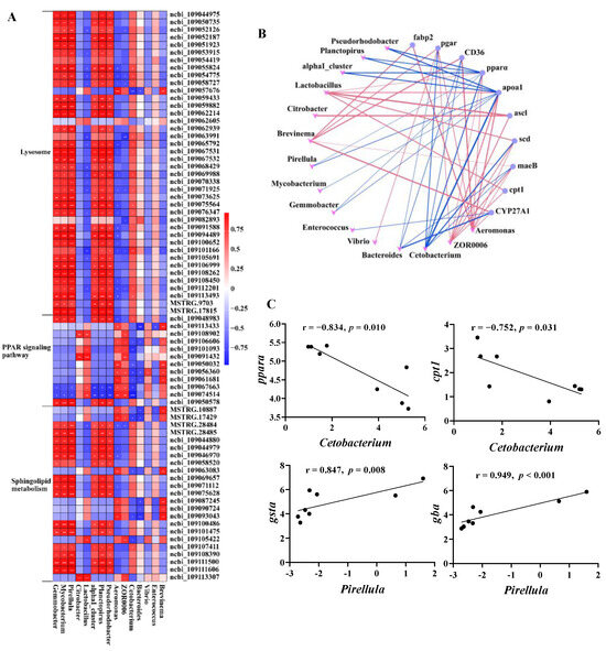 In addition to the overall network, Figure 9C illustrates the correlation between representative gene expression and microbial taxa, both of which have previously been linked to host health and thus may be of interest. The pparα, a crucial regulator of lipid metabolism, was significantly negatively correlated with Cetobacterium (r = −0.834, p = 0.01). Similarly, cpt1, a vital enzyme involved in fatty acid oxidation, exhibited a negative correlation with Cetobacterium (r = −0.752, p = 0.031). Furthermore, both gsta (r = 0.874, p = 0.008) and gba (r = 0.949, p < 0.001) showed a positive correlation with Pirllula. CTSA (Cathepsin A) is a key proteolytic enzyme in the lysosome, while GBA (glucosylceramidase) is a crucial enzyme in the catabolic pathway for glucosylceramide, a membrane sphingolipid and a precursor for various glycolipids.