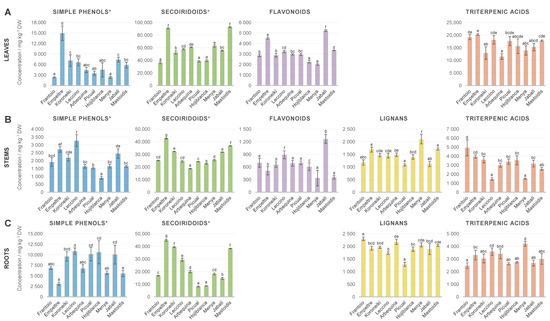 As far as simple phenols and glycoside derivatives were concerned, they were found in all three evaluated matrices. Roots were the matrix with the highest percentage of these types of compounds (40–70%), except for ‘Empeltre’, in which leaves were the richest plant organ with around 70% of the total. In the rest of the cultivars, leaves accounted for 20–40%, while the remaining 5–15% was found in stems. It is worth noticing that the distribution of individual metabolites belonging to this group was also diverse (Table 1); verbascoside and isoverbascoside were the only simple phenol glycosides found in roots; phenylethyl primeveroside was just detected in stems and hydroxytyrosol in leaves. Secoiridoids and related compounds were mostly found in leaves (45–60%), followed by stems (20–35%) and roots (10–30%). As previously mentioned, oleuropein was the secoiridoid found at the highest rates, ranging from 6736 mg kg−1 (in ‘Hojiblanca’ roots) to 74,453 mg kg−1 DW (in ‘Mastoidis’ leaves). Triterpenic acids was the other family of metabolites distributed throughout the three studied tissues. Between 65 and 75% of these compounds were found in leaves, followed by roots and stems with 5–20%, each. Oleanolic acid was the compound found at the highest concentration in leaves (10,152–15,670 mg kg−1 DW) and stems (1064–3775 mg kg−1 DW), while maslinic acid was the most concentrated in roots (2181–3897 mg kg−1 DW). No flavonoids were detected in roots, which agrees with previous works in which they were not found [27,41,53] or were reported at very low concentration levels [50,51]. Flavonoids were mostly found in leaves (80–90%), with minor amounts quantified in stems (510 to 1267 mg kg−1 DW). Moreover, as seen in Table 1, just the three isomers of luteolin O-glucoside and rutin were common to both matrices; quercetin O-glucoside, dihydroquercetin 3-O-glucoside, cyanidin O-glucoside, dihydrokaempferol and taxifolin were absent from leaves, and apigenin 7-O-glucoside, apigenin O-rutinoside, diosmin and gallocatechin were not found in stems. A comparable trend was observed for lignans. They were distributed homogeneously amongst roots (45–65%) and stems (35–55%) but were missing in leaves. Most of them were found in both matrices except for cycloolivil, which was only found in stems, and its glycosylated form, which appeared just in roots. Acetoxypinoresinol glucoside was the most abundant lignan in most cultivars, with contents ranging from 494 to 1588 mg kg−1 DW in stems, and 262 to 1001 mg kg−1 DW in roots. The absence of this family of compounds in olive leaves has been widely documented in other works dealing with the LC-MS phenolic profiling of leaves [41,54,55], while other authors have reported very low levels of lignans in this olive tissue [30,39,56].