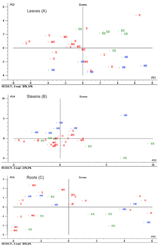 Principal component analysis (PCA) score plots representing the two principal components (PCs) showing best samples’ grouping for each olive tissue: (A) leaves (PC1 vs. PC2), (B) stems (PC1 vs. PC4) and (C) roots (PC1 vs. PC5).