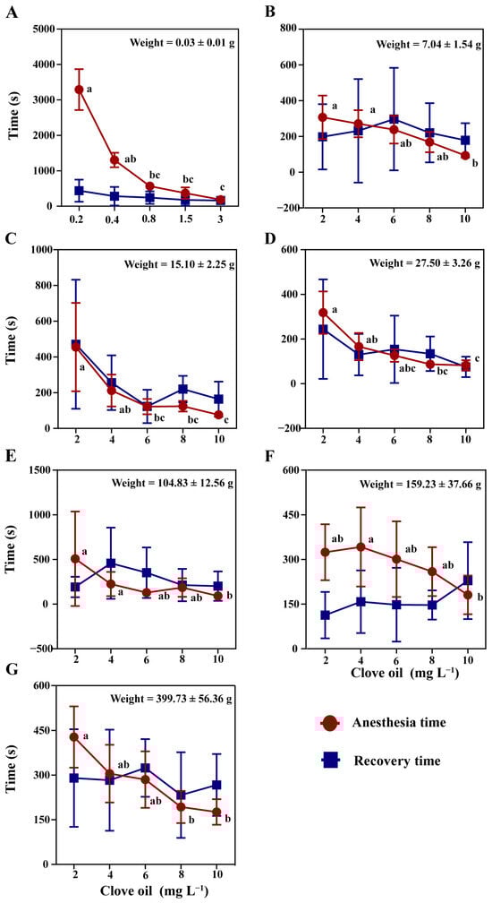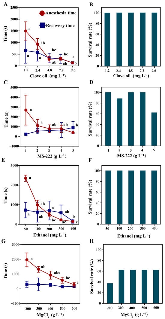 - Jia, Y.; Xie, T.; Gao, Y.; Qin, H.; Guan, C. Anesthetics efficacy and physiological response of MS222 and clove oil in spotted knifejaw Oplegnathus punctatus. Aquacult. Rep. 2022, 25, 101201. [Google Scholar] [CrossRef]