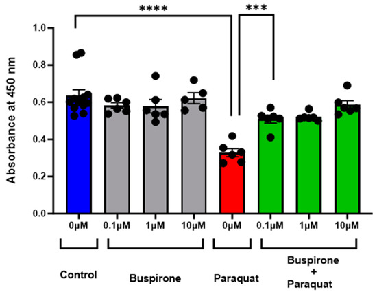 Effect of Buspirone Pretreatment on Paraquat-Induced Cell Death in ARPE-19 Cells as Assessed via WST-1 Assay. The graph depicts the absorbance values obtained via WST-1 assay, reflecting cell viability, in ARPE-19 cells subjected to various treatments. The x-axis represents different treatment groups: (1) control, (2) buspirone-treated, (3) induced cell death, and (4) buspirone pre-treatment + paraquat. The y-axis denotes the absorbance measured at 450 nm. Data points represent the mean ± standard error of mean of n = 6, with 3 independent experiments. Statistical significance was determined using Student’s t-test between two groups, with p < 0.05 considered as statistically significant. *** p < 0.001, **** p < 0.0001.