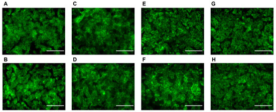 Immunocytochemical Staining of Differentiated ARPE-19 Cells Treated with Paraquat and Buspirone. The images display the immunocytochemistry of differentiated ARPE-19 cells subjected to different treatments. ZO-1, a marker for tight junctions, is labeled in green. (A,B) Control group, (C,D) paraquat (1000 μM)-induced cell stress, (E,F) buspirone (1 μM)-pre-treated cells followed by paraquat (1000 μM) exposure, and (G,H) buspirone (10 μM) pre-treated cells followed by paraquat (1000 μM) exposure. (40× magnification, scale bar 100 micron).