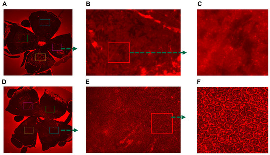 Buspirone Preserves RPE Structural Integrity In Vivo: RPE Flat Mount Immunostaining for ZO-1. The images demonstrate the effects of buspirone treatment on RPE (Retinal Pigment Epithelium) structural integrity in vivo. (A) Mice injected with NaOI3 but untreated with buspirone served as a comparison (4× magnification). (B) 20× magnification, (C) 100× magnification, (D) The buspirone treated mouse showed preserved RPE morphology in response to buspirone administration (4× magnification). (E) 20× magnification. (F) 100× magnificationThe RPE choroid tissues were processed for immunostaining for ZO-1 (Zonula Occludens-1) and red fluorescence is visualized using fluorescence microscopy, highlighting tight junctions within the RPE.