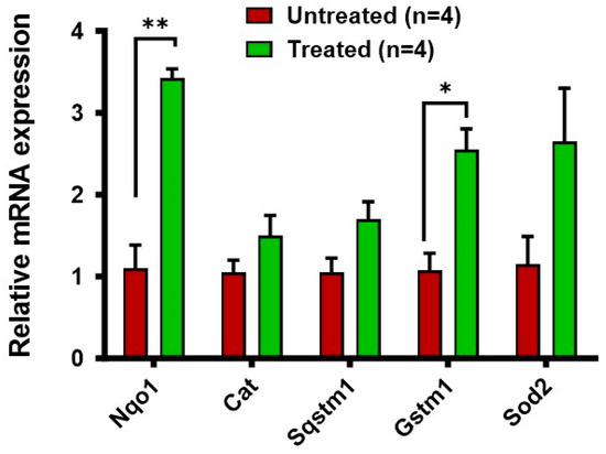 Relative mRNA Expression of Antioxidant Genes in RPE/Choroid: Buspirone-Treated Eyes vs Untreated Control Eyes. The graph illustrates the comparative mRNA expression levels of key antioxidant genes in the RPE/choroid complex. Buspirone-treated eyes are represented in green, while untreated control eyes are indicated in red. Data are normalized to beta-actin and presented as fold change relative to control. Antioxidant genes analyzed include Nqo1, Cat, Sqstm1, Gstm1, and Sod2, known for their pivotal role in oxidative stress response. Data represents the mean ± standard error of the mean (SEM) of n = 4. Statistical significance was determined using Student’s t-test between two groups, with p < 0.05 considered as statistically significant. * p < 0.05, ** p < 0.01.
