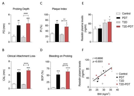 Clinical parameters for periodontitis evaluation, blood plasma resistin levels, and correlation between plasma resistin levels and body mass index (BMI). Values of probing depth (A), clinical attachment loss (B), plaque index (C), bleeding on probing (D), and (E) resistin levels evaluated in plasma obtained from control individuals, PDT, T2D, and T2D-PDT patients. (F) correlation of resistin levels with BMI values of the same patients for all groups. Data are presented as the mean ± SEM from 3–10 individuals per group. Statistical analysis: ## p < 0.01; ### p < 0.001; #### p < 0.001 by the Kruskal–Wallis test with multiple comparisons; * p < 0.05; ** p < 0.01; *** p < 0.001; **** p < 0.001 by one-way ANOVA with multiple comparisons, when compared to the respective control.