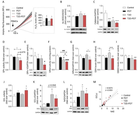 H2O2 production, antioxidant profile, and Nrf2 levels in PBMCs. (A) Representative traces of H2O2 production evaluated using the Amplex Red assay and quantification of H2O2 production (slope/15 min; inset); (B) Ac-SOD2/SOD2 (24/25 kDa) and (C) catalase (60 kDa) protein levels; (D) GPx activity and (E) GPx-1 (22 kDa) protein levels, (F) GRed activity and (G) protein levels (58 kDa); (H) reduced glutathione (GSH) levels and (I) oxidized glutathione (GSSG) levels; (J) GCL activity and (K) GCLc (73 kDa) protein levels; (L) Nrf2 (68 kDa) protein levels and (M) correlation between GCLc and Nrf2 protein levels. GAPDH (36 kDa) was used as control loading for western blots. Data are presented as the mean ± SEM, performed in PBMCs isolated from control individuals, PDT, T2D, and T2D-PDT patients, 10 individuals per group, run in duplicates to quadruplicates. Statistical analysis: # p < 0.05; ### p < 0.001; #### p < 0.001 by the Kruskal–Wallis test with multiple comparisons; * p < 0.05; ** p < 0.01; *** p < 0.001; **** p < 0.001 by one-way ANOVA with multiple comparisons, when compared to the respective control.