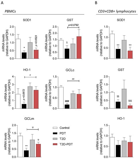 mRNA levels of Nrf2 target genes in PBMCs and CD3+CD8+ lymphocytes. Relative expression of (A) SOD1, GST, HO-1, GCLc, and GCLm mRNA in PBMCs or (B) SOD1, GST, and HO-1 in CD3+CD8+ lymphocytes, from control individuals, PDT, T2D, and T2D-PDT patients PBMCs prepared as described in the Section 2. GAPDH was used as the housekeeping messenger. Data are presented as the mean ± SEM from 4 individuals per group. Statistical analysis: * p < 0.05; ** p < 0.01 by one-way ANOVA with multiple comparisons; # p < 0.05; ## p < 0.01; ### p < 0.001 by the Kruskal–Wallis test with multiple comparisons; § p < 0.05; §§ p < 0.01; §§§ p < 0.001 by unpaired Student’s t-test; φ p < 0.05 by the Mann–Whitney test when compared to the respective control.