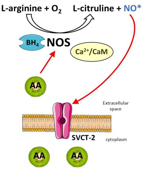 Vitamin C and NO signalling. Increase in Ca2+ leads to the formation of Ca2+/CaM complex, which binds NOS and stimulates NO production from L-arginine. NO increases the expression of sodium-dependent vitamin C transporter (SVCT-2) allowing for vitamin C intracellular accumulation. Ascorbate also affects regeneration of tetrahydrobiopterin (BH4) positively modulating NO generation.