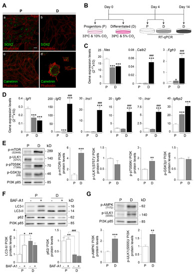 Progenitor and differentiated HEI−OC1 auditory cells show distinct metabolic profiles depending on the differentiation stage. (A) Representative confocal images of HEI−OC1 progenitor (P) and differentiated (D) auditory cells immunolabeled for SOX2 (a,b) and calretinin (c,d), both in green. Cells were incubated at 33 °C and 10% CO2 (HEI−OC1 P) or at 39 °C and 5% CO2 (HEI−OC1 D) for 4 days. Cellular cytoskeleton was stained with Alexa Fluor® 546 phalloidin. Scale bar = 20 µm. (B) HEI−OC1 P cells were cultured for 4 days under proliferative conditions, and HEI−OC1 D cells were cultured for 4 or 14 days under differentiation conditions. Cells were then lysed, and the expression of target genes was analyzed by qPCR. (C,D) mRNA expression levels of Nes, Calb2 and Fgfr3 (C) and of Igf1, Igf2, Ins1, Igf1r, Insr and Igfbp2 (D) were measured in HEI−OC1 P cultured for 4 days (white bars) and in HEI−OC1 D cells incubated for 4 (gray bars) or 14 (black bars) days. Gene expression levels were calculated as 2−ΔCt using Hprt1 as an endogenous housekeeping gene. Data are expressed as mean ± SEM from n = 3−11 independent samples measured in triplicate. Statistical significance was estimated by one-way ANOVA: * p < 0.05 and *** p < 0.001 versus HEI−OC1 P; ### p < 0.001 versus HEI−OC1 D for 4 days. (E) HEI−OC1 P (white bars) and HEI−OC1 D (gray bars) cells were cultured for 4 days. Western blotting was performed to assess p−mTOR (Ser2448), p−ULK1 (Ser757), p−p70S6K (Thr389) and p−GSK3β (Ser9) levels. (F) HEI−OC1 cells cultured as previously described were treated with BAF−A1 (100 nM) for 6 h and lysed for the immunodetection of LC3−II and p62. (G) HEI−OC1 cells cultured as previously described were lysed for the immunodetection of p−AMPK (Thr172) and p−ULK1 (Ser555). Representative Western blots from at least n = 4 independent samples per condition are shown. PI3K p85 was used as a loading control. Data are shown as mean ± SEM. Statistical significance was determined by Student’s t−test (** p < 0.01 and *** p < 0.001 versus HEI−OC1 P) or by one−way ANOVA (* p < 0.05 and ** p < 0.01 versus HEI−OC1 P; ### p < 0.001 versus HEI−OC1 P + BAF−A1), as indicated for two or more than two experimental groups, respectively.