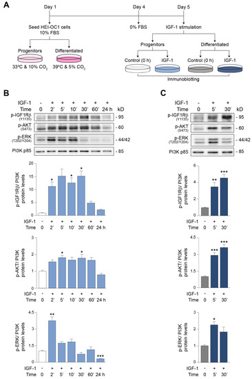 IGF-1 downstream signaling is rapidly and transiently activated once IGF-1 interacts with IGF1R, triggering long-term effects in gene expression and cellular processes that are cell-type specific [33,55,56]. Thus, we next studied the downstream signaling pathways in progenitor and differentiated HEI-OC1 cells after IGF-1 treatment, following the experimental scheme described in Figure 3A and considering that HEI-OC1 cell differentiation triggers apoptosis, which limits the biological material available for further studies. Progenitor and differentiated cells were cultured in serum-free medium (control experimental group) for 24 h before treatment or not with IGF-1 to study temporal responses. The relative phosphorylation levels of the main downstream targets of IGF-1 (IGF1Rβ, AKT and ERK) were then examined by Western blotting in the protein extracts of progenitor (Figure 3B) and differentiated (Figure 3C) cells.