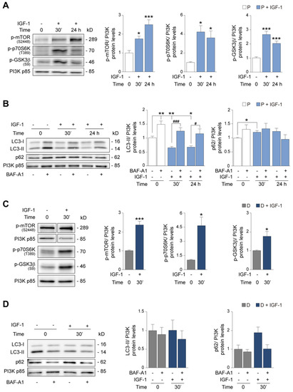 IGF−1 stimulates anabolism and reduces autophagic flux in HEI−OC1 progenitor cells. (A) HEI−OC1 P cells were cultured as shown in Figure 3A and left untreated (white bars) or treated (light blue bars) with IGF−1 (10 nM) for 30 min or 24 h and then lysed for the immunodetection of p−mTOR (Ser2448), p−p70S6K (Thr389) and p−GSK3β (Ser9). (B) HEI−OC1 P cells were starved for 24 h and left untreated (white bars) or treated (light blue bars) with IGF−1 (10 nM) for 30 min or 24 h, BAF−A1 (100 nM) for 6 h, or a combination of both, as indicated. Cells were lysed, and LC3−II and p62 levels were analyzed by Western blotting. Representative immunoblots from at least n = 3 independent experiments are shown. PI3K p85 was used as a loading control. Data are expressed as mean ± SEM. Statistical significance was determined using one−way ANOVA: * p < 0.05, ** p < 0.01 and *** p < 0.001 versus control (0 h); # p < 0.05 and ### p < 0.001 versus IGF−1 at the same experimental time. (C) HEI−OC1 D cells were cultured as shown in Figure 3A and left untreated (gray bars) or treated (dark blue bars) with IGF−1 (10 nM) for 30 min and lysed for the immunodetection of p−mTOR (Ser2448), p−p70S6K (Thr389) and p−GSK3β (Ser9). (D) HEI−OC1 D cells were starved for 24 h and left untreated (gray bars) or treated (dark blue bars) with IGF−1 (10 nM) for 30 min, BAF−A1 (100 nM) for 6 h, or a combination of both, as indicated. Cells were lysed, and LC3−II and p62 levels were analyzed by Western blotting. Representative immunoblots from at least n = 4 independent samples per condition are shown. PI3K p85 was used as a loading control. Immunoblots for p−mTOR (Ser2448) and its control came from non-consecutive lanes. Data are expressed as mean ± SEM. Statistical significance between the two experimental groups was determined by Student’s t−test: * p < 0.05 and *** p < 0.001 versus control (0 h).