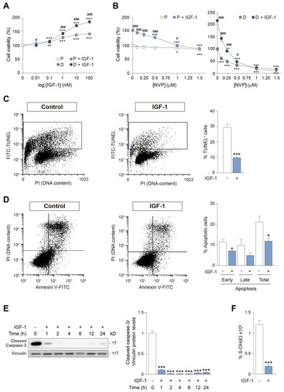 IGF-1 treatment enhanced the viability of both progenitor and differentiated HEI-OC1 cells in a dose-dependent manner (Figure 5A). The dose–response profile further suggested that IGF-1 acted through IGF1R [20]. To further confirm this observation, we treated cells with NVP, a selective inhibitor of IGF1R tyrosine kinase autophosphorylation and activation [57]. HEI-OC1 cells were pre-treated with increasing concentrations of NVP for 2 h before treatment with IGF-1 for 24 h (Figure 5B). Results showed that NVP alone had no influence on the viability of HEI-OC1 progenitor cells, but it dose-dependently suppressed the protective effect of IGF-1 (Figure 5B, left panel). Contrastingly, cell viability was lower in NVP-pre-treated differentiated HEI-OC1 cells both in the absence and presence of IGF-1 (Figure 5B, right panel), suggesting that differentiated auditory cells are highly dependent on IGF-1 levels.