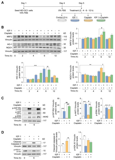 Ototoxic effects induced by short−term exposure to cisplatin are neutralized by IGF−1. (A) HEI−OC1 P cells were cultured in DMEM with 10% FBS for 72 h and then switched to a control medium for 24 h and left untreated (white bars) or treated with IGF−1 (10 nM) (light blue bars), cisplatin (4 µg/mL) (yellow bars) or a combination of both (green bars) for 2, 4, 6 and 12 h and lysed for the analysis of target proteins. (B) Levels of NRF2, HO−1 and NQO1 were measured by Western blotting. Representative immunoblots from at least n = 4 independent experiments are shown. (C) Levels of p−IGF1Rβ (Tyr1135), p−AKT (Ser473) and p−ERK (Thr202/Tyr204) were analyzed by Western blotting. Representative immunoblots from at least n = 4 independent experiments are shown. (D) Levels of cleaved caspase−3 and p−H2A.X (Ser139) were measured by Western blotting. Representative immunoblots from at least n = 3 independent experiments are shown. Vinculin was used as a loading control. Data are expressed as mean ± SEM. Statistical significance was determined by one−way ANOVA: ** p < 0.01 and *** p < 0.001 versus control (0 h); # p < 0.05 and ## p < 0.01 versus IGF−1; $ p < 0.05, $$ p < 0.01 and $$$ p < 0.001 versus cisplatin.