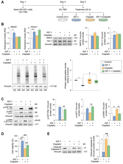 Cytotoxic effects of cisplatin are observed at longer treatment times; therefore, we studied the response of HEI-OC1 cells exposed to IGF-1 or cisplatin, alone or in combination, for 24 h (Figure 7A). Under these conditions, IGF-1 treatment alone significantly increased (1.5-fold) the levels of Nfe2l2 and Hmox1, coding, respectively, for NRF2 and HO-1, although this was not reflected at the protein level (Figure 7B). IGF-1 also lowered (0.5-fold) the oxidative protein carbonylation levels of HEI-OC1 cells (Figure 7B). Cisplatin treatment alone increased the protein levels of HO-1 (1.4-fold), but no other significant changes were observed in the other conditions tested. IGF-1 co-treatment was unable to influence protein carbonylation induced by 24 h exposure to cisplatin (Figure 7B). IGF-1 activated IGF1R and AKT in the presence of cisplatin (Figure 7C), and cell viability increased when cisplatin and IGF-1 were combined with respect to cisplatin alone, which decreased cell viability (Figure 7D). Notably, the cisplatin-sustained activation of ERK (1.6-fold) was suppressed by co-treatment with IGF-1 (Figure 7C). It has been reported that ERK activation has different outcomes depending on whether it is transitory or sustained. Indeed, the sustained activation of ERK is a major mediator of cisplatin-induced ototoxicity and leads to cell death [60,61]. Finally, IGF-1 treatment significantly decreased the levels of activated caspase-3, both alone (0.6-fold) and in combination with cisplatin (0.4-fold). Nevertheless, IGF-1-mediated protection was partial and did not completely prevent the activation of caspase-3 induced by 24 h exposure to cisplatin (Figure 7E). These results, taken together with the IGF-1-induced increase in cell viability, indicate that IGF-1 counteracts the ototoxic effects of cisplatin in HEI-OC1 cells.