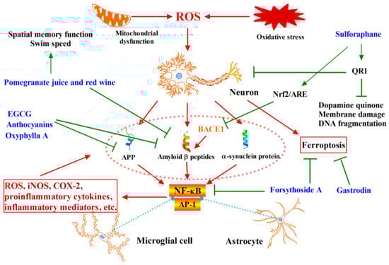 Numerous studies of cell culture and animal models have demonstrated that dietary supplementation with specific fruits or vegetables, or their extracts or specific chemical components, could prevent neurodegenerative diseases. For example, as shown in Figure 2, dietary supplementation with blueberries protected dopaminergic neurons against dysfunction and degeneration in a rat model of Parkinson’s disease, and improved learning and memory without affecting amyloid pathology in a mouse model of Alzheimer’s disease [50]. Drinking pomegranate juice reduced the amount of amyloid and improved behavioral deficits in a mouse model of Alzheimer’s disease [51]. Moderate consumption of red wine reduced amyloid pathology in a mouse model of Alzheimer’s disease [52]. For specific phytochemicals, toxic protein production can be reduced and activation of the Nrf2-Keap1-HO-1 signaling pathway is observed. Sulforaphane showed its neuroprotective effect in animal and cell models of neurodegenerative condition [53], and it can activate Nrf2 to inhibit BACE1 mRNA expression and reduce Aβ production in the prevention of Alzheimer’s disease [54]. Anthocyanins were detected to activate the Nrf2/HO-1 pathway, attenuating elevated ROS levels and oxidative stress in APP/PS1 mice and hippocampal HT22 cells induced by β-amyloid oligomerism (AβO) [55]. Oxyphylla A reduced the expression levels of amyloid precursor protein (APP) and amyloid beta protein (Aβ) alleviated cognitive decline in SAMP8 mice [56]. Curcumin, resveratrol, and green tea catechins revealed a positive relationship between consumption of these compounds and the prevention of AD [57], accompanying a reduction of the formation of neurotoxic β-amyloid fibrils [58].