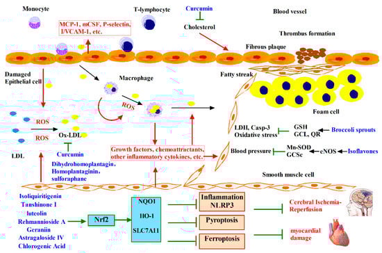 Phytochemicals target Nrf2 for cardiovascular diseases intervention. Ox-LDL can damage endothelial cells and induce the expression of proinflammatory cytokines. Monocytes take up lipoproteins and metamorphoze into macrophages, which can produce reactive ROS, and subsequently convert Ox-LDL to highly oxidized LDL and form foam cells, combine with leukocytes to form fatty streaks and eventually form fibrous plaques that protrude into the arterial lumen, leading to vascular obstruction. A variety of phytochemicals are found to activate the Nrf2 signaling pathway to ameliorate oxidative stress and prevent fibrous plaque formation. Phytochemicals attenuate heart and brain damage after ischemia-reperfusion injury by inhibiting inflammation, apoptosis and ferroptosis.