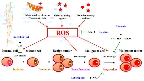 Cancer development in humans is a multistep, long-term process, in which cancer cells acquired several biological capabilities such as sustaining proliferative signaling, evading growth suppressors, resisting cell death, enabling replicative immortality, inducing angiogenesis, activating invasion and metastasis, reprogramming of energy metabolism, evading immune destruction, genome instability and mutation and tumor-promoting inflammation [88]. Due to cancer pathogenesis being traceable back to that impact cell growth and metastasis, oxidative stress is one of the main causes for carcinogenesis.