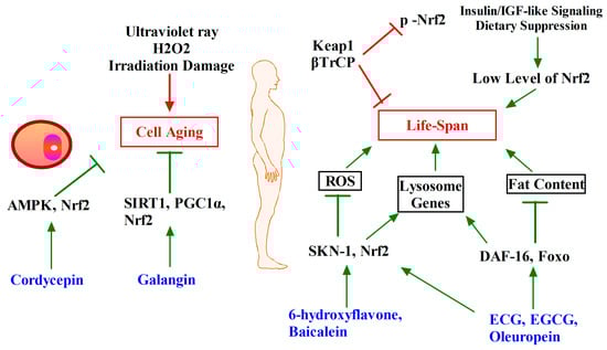 In addition, damage to cells by external factors such as the environment can also lead to senescence and reduce life span, such as ultraviolet radiation. Galangin can activate SIRT1/PGC-1α/Nrf2 signaling pathway [148], and cordycepin can bind and activate AMPK/Keap1/Nrf2 to increase the expression of antioxidant enzymes, thereby preventing cell senescence [138].