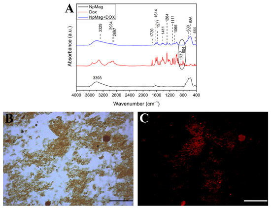 Figure 1B,C show the light and fluorescence microscopy images, respectively, for the NpMag+Dox sample. The images show fluorescence in the red region due to Dox excitation, indicating its presence in nanoparticles. The mean hydrodynamic radius (RH), the polydispersity index (PDI), and the zeta potential (ζ) for the samples are shown in Table 1. The increase in the hydrodynamic radius in the NpMag+Dox sample indicates the presence of the Dox molecule on the surface of the nanoparticles when compared to the pure sample. The PDI values, both >10%, indicate that the samples are moderately polydispersed. The ζ values indicate a low stability of samples dispersed in water [34]. However, an increase in surface charge from −9.6 to −0.7 mV strongly suggested that positively charged Dox molecules are bound to negatively charged nanoparticles through electrostatic interactions [35].