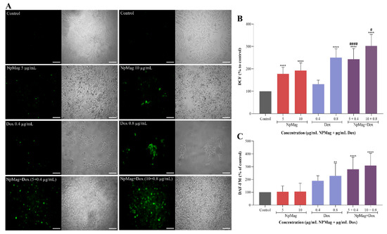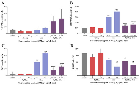 Figure 4A shows that NpMag+Dox 0.8 µg/mL induced a significant increase (289%) in DNA fragmentation compared to the control. The NpMag and Dox did not induce any DNA fragmentation compared to the control.