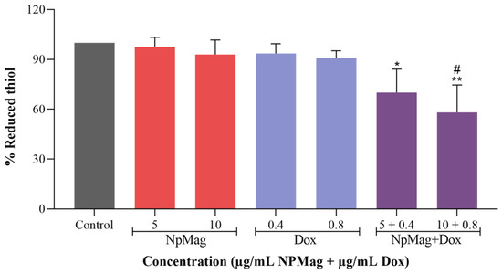 As shown in Figure 3, NpMag+Dox induced a significant decrease (30% and 42%) in reduced thiols levels at concentrations of 0.4 and 0.8 µg/mL in 48 h, compared to the control. NpMag+Dox 0.8 µg/mL also induced a significant decrease in reduced thiols levels (36%), compared to the Dox at the same concentration. Dox and NpMag did not induce any reduction in the reduced thiols levels, compared to the control.