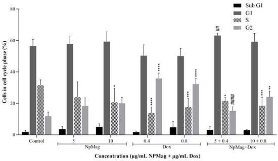 Cell cycle phases by PI fluorescence in breast cancer cells, MCF-7, treated with 5 and 10 µg/mL of NpMag and 0.4 and 0.8 µg/mL of Dox and NpMag+Dox. * p < 0.05, ** p < 0.01, *** p < 0.001, **** p < 0.0001 compared to the control. ## p < 0.01, #### p < 0.0001 significant difference compared to the same concentration of Dox.