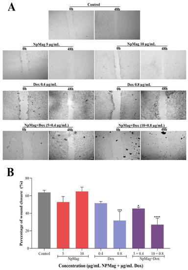 (A): Analysis of cell migration from the wound healing assay images. (B): Percentages of in vitro closure area by the wound healing assay (B) after 48 h of MCF-7 cells treated with 5 and 10 µg/mL of NpMag and 0.4 and 0.8 µg/mL of Dox and NpMag+Dox. Scale bar: 200 µm. * p < 0.001, *** p < 0.001, **** p < 0.0001 significant difference compared to the control.