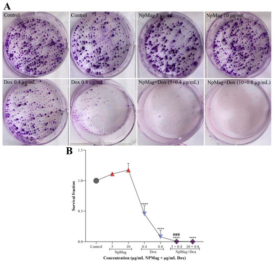 Surviving fraction of the clonogenic assay in breast cancer cells, MCF-7, treated with 5 and 10 µg/mL of NpMag and 0.4 and 0.8 µg/mL of Dox and NpMag+Dox. (A): Representative images and, (B): Survival fraction graph. **** p < 0.0001 significant difference compared to the control. ### p < 0.001 significant difference compared to the same concentration of Dox.