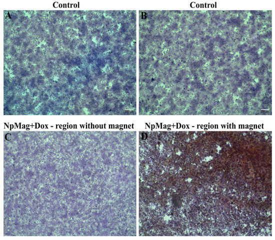 Figure 8 shows the treatment efficiency of MCF-7 cells with NpMag+Dox through microscopic analyses that clearly revealed morphological changes and a detachment of MCF-7 cells after treatment with NpMag+Dox in the region where the magnet was placed, as shown in Figure 8D, compared to the control.