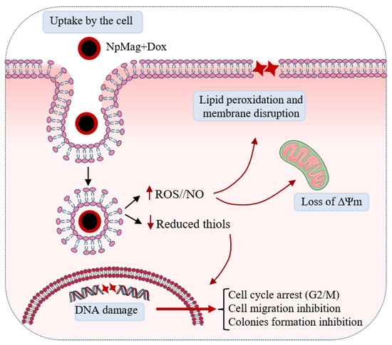 Our results showed that Dox-loaded magnetic nanoparticles induce oxidative stress in MCF-7 cells evidenced here by a set of results that, together, lead breast cancer cells to interrupt the cell cycle and decrease migration (Figure 9). This association seems to improve Dox delivery, mainly in the presence of a magnetic field, which might reduce toxicity and provide better efficacy for the treatment. In fact, iron-oxide nanoparticles and doxorubicin association is a candidate for an antitumor drug that has great potential as a promising agent for anticancer therapy.