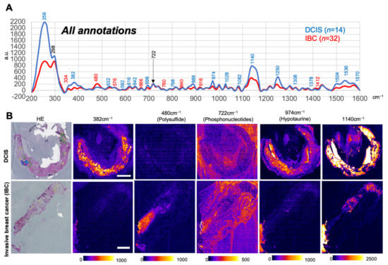 Among these SERS peaks, representative SERS images visualized with low magnification are shown in Figure 1B. Results indicate that polysulfide identified at 480 cm−1 is significantly greater in IBC than in DCIS, while hypotaurine at 974 cm−1 is significantly greater in DCIS than in IBC. The peak at 722 cm−1 did not differ between DCIS and IBC. Since this peak indicated the presence of high-energy purine phosphor-nucleotides such as ATP and ADP, the results suggest that viability of the frozen tissue samples was maintained [8]. Figure S3 illustrates dot plots of individual data at each wave numbers, indicating that 27 specific wave numbers were identified in fingerprint regions of SERS spectra to distinguish DCIS from IBC. As described later in Results, the peak at 382 cm−1 was unassignable but accounted for the most reliable hallmark of differential diagnosis of DCIS which disappeared in IBC.