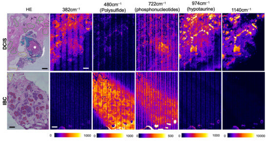 To further clarify the relationship between SERS signals and pathological annotations judged by HE staining, the SERS images were captured at higher spatial resolution. As seen in Figure 2, several images captured at specific wave numbers displayed contrast differences between DCIS and IBC. Among them, the polysulfide signal at 480 cm−1 exhibited greater intensities in IBC than in DCIS. By contrast, the signal in IBC displayed a modest increase in the signal in cancer cell nests that coincided with a remarkable elevation in the surrounding stromal regions. As a result, the elevation of polysulfide signal cancer-associated stromal regions accounted for an important feature of desmoplastic reactions that occur in the stroma of IBC. On the other hand, the hypotaurine signal at 974 cm−1 and the unidentified signal at 1140 cm−1 colocalized each other, and the spot signals appeared to occur along the DCIS cells, which were featured by marking in light blue (Figure 2). The site of calcification did not exhibit the hypotaurine signal (see asterisk). Note that these results suggest that the pattern of reactive sulfur species differs between DCIS and IBC.