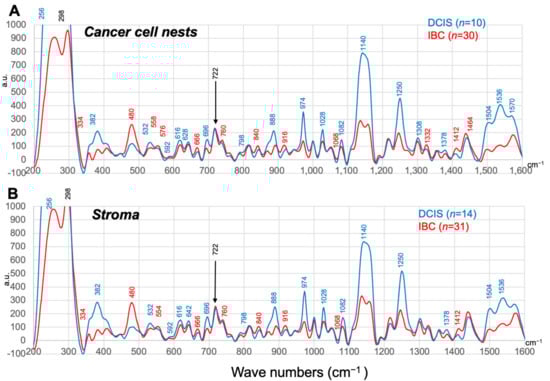(A) The averaged SERS spectra from cancer cell nest regions of DCIS (blue, n = 10) and those of invasive breast cancer (IBC: red n = 30). (B) The averaged SERS spectra from stroma regions of DCIS (blue, n = 14) and those of invasive breast cancer (IBC: red n = 31). Intensities are expressed as arbitrary units (a.u.). Peaks showing significant differences between DCIS and invasive cancer are marked in blue (DCIS > IBC) and red (DCIS < IBC), respectively.