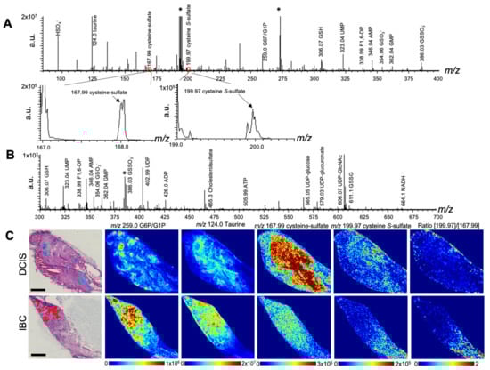 Imaging mass spectrometry of tissue sections derived from ductal carcinoma in situ (DCIS) and invasive breast cancer (IBC). (A) Averaged mass spectrum of needle biopsy specimen in negative mode in a range of m/z 85–400. Left and right insets indicate magnified spectrum around m/z 168.0 (cysteine sulfate) and that around m/z 200 (cysteine S-sulfate) (B) Averaged mass spectrum in a range of m/z 300–700, respectively. * Artifacts yielded by matrix. (C) Representative pictures of HE staining and MALDI-mass spectrometric imaging at m/z 259.0, m/z 124.0, m/z 167.99, m/z 199.97, and ratio image of [199.97]/[167.99] in DCIS and IBC at spatial resolutions of 25 µm per pixel. After capturing mass spectrometric images, HE staining was performed in the same tissue slices. Annotations in HE staining show cancer cells in DCIS in blue and those in IBC in red. Bars indicate 1 mm.