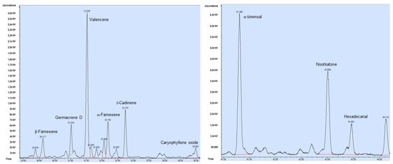 The cold-pressing technique is a unique process applied to extract edible oils from various oily seeds, kernels, peels, and fruits. This technique is important in producing specialty oils with typical characteristic aroma compounds and functional and nutritional compositions. Cold-pressed oils are preferred for their desirable flavour (α- and β-sinensal) characteristics, with their antioxidant components (phenolic compounds, nootkatone, valencene) having therapeutic effects [11,36]. Indeed, the cold-pressing method is common and one of the best techniques for isolating EOs. Using this method, pressure is applied to the plant sample without enhancing the temperature. This extraction technique has significant advantages compared to other extraction techniques, such as the lower energy costs and the fact it does not require a solvent or advanced equipment. The extraction methods influence the EO composition; as reported by González-Mas et al. [37], steam distillation could result in the loss of certain compounds with high molecular weights and low volatility, such as certain phenolic compounds. This observation is consistent with our results, where the concentration of phenolic compounds was eight times higher in the EOP than in the EOPD.