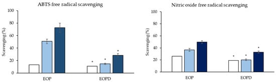 Free radical scavenging activity levels of different essential oil concentrations. EOP: Essential oil obtained by cold-pressed method; EOPD: essential oil obtained by cold-pressed method followed by steam distillation. Concentrations assayed for ABTS in EOP at 1.5 (□), 8 (■), and 12 (■) µL/mL and EOPD at 12 (□), 15 (■), and 30 (■) µL/mL. Concentrations assayed for nitric oxide in EOP at 15 (□), 30 (■), and 60 (■) µL/mL and EOPD at 30 (□), 60 (■), and 150 (■) µL/mL. Data are presented as means ± SEMs (n = 3); * represents significant differences between the oils, according to Tukey’s test (p < 0.05).