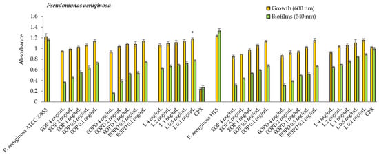 Growth and biofilms of Pseudomonas aeruginosa (ATCC 27853 and HT5 strains). EOP: Essential oil obtained by cold-pressed method; EOPD: essential oil obtained by cold-pressed method followed by steam distillation; L: limonene; CPX: ciprofloxacin. Data are presented as means ± SEMs (n = 8) of three independent experiments. All experiments show significant differences compared to the respective controls (p < 0.05), except the sample with asterisk (*).