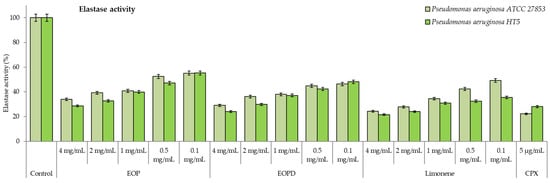 Elastase activity of Pseudomonas aeruginosa ATCC 27853 and HT5 strains. EOP: Essential oil obtained by cold-pressed method; EOPD: essential oil obtained by cold-pressed method followed by steam distillation; L: limonene; CPX: ciprofloxacin. Data are presented as means ± SEMs (n = 8) of three independent experiments. All experiments show significant differences compared to respective controls (p < 0.05).