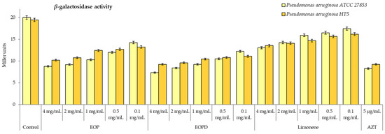 The β-galactosidase activity of Pseudomonas aeruginosa ATCC 27853 and HT5 strains. EOP: Essential oil obtained by cold-pressed method; EOPD: essential oil obtained by cold-pressed method followed by steam distillation; L: limonene; AZT: azithromycin. Data are presented as means ± SEMs (n = 8) of three independent experiments. All experiments show significant differences compared to respective controls (p < 0.05).