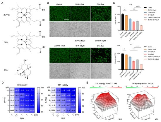 ZnPPIX enhances the anti-cancer activity of DHA. (A) Structures of heme, ZnPPIX, and dihydroartemisinin (DHA). (B) DHA inhibition on tumor cell growth is significantly potentiated in the presence of ZnPPIX. Representative fluorescence microscope images of B16 cells treated with DHA, ZnPPIX alone or in combination (bar = 125 µm). Cells were stained with Calcein-AM. Photos were taken under green fluorescence and bright field conditions, respectively. (C) Cytotoxicity analysis of DHA and ZnPPIX on B16 and 4T1 tumor cell lines (** p < 0.01, *** p < 0.001, **** p < 0.0001). (D) Dose–response matrix (inhibition) of B16 and 4T1 cells with DHA and ZnPPIX. (E) DHA and ZnPPIX inhibition synergy landscapes for B16 and 4T1 cells. Drug combination landscapes were built by “synergyfinder”. One representative replicate (with maximal synergy closest to its average value) is shown. Drug combination landscapes: z-axis, synergy score (ranges from −40, green, to +40, red); x/y-axes, DHA/ZnPPIX concentration range, respectively.