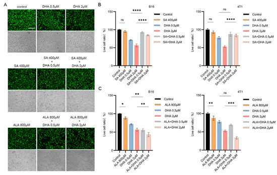 B16 or 4T1 cells were seeded at 4000 cells/well into 96-well plates and incubated for 24 h. After removing the medium, the cells were treated with new medium supplemented with specified reagents for 24 h. DHA (MACLIN, Shanghai, China) was used at concentrations of 0.5 μM, 1 μM, 2 μM, and 5 μM, and ZnPPIX (Frontier Scientific Inc., Logan, UT, USA) at concentrations of 2 μM, 5 μM, 10 μM, and 20μM; SA (MedBio, Shanghai, China) was used at 400 μM and ALA (MACLIN, Shanghai China) at 600 μM; ferrastatin-1 (MCE, Monmouth Junction, NJ, USA) was administered at 2 μM and vitamin E (Abcam, Cambridge, UK) at 500 μM. The supernatant was removed, and the cells were treated with 2 µM Calcein-AM dissolved in 100 µL of HBSS for 10 min to identify the status of the cells. Survival of the cells was recorded by fluorescence microscopy, and the number of viable cells was counted by Image J Version 1.53t [25,26].