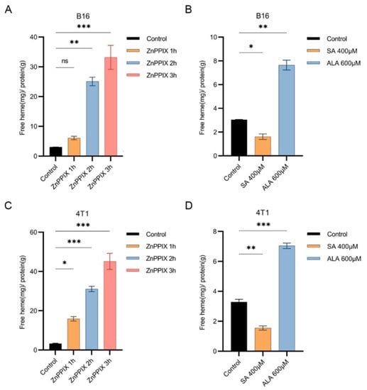 Heme quantification was performed essentially as previously desctibed [24,33]. 4T1 or B16 cells were seeded at 20,000 cells/well into 6-well plates and cultivated for 24 h. For the 10 μM ZnPPIX group, treatment time of 1, 2, and 3 h was performed; 3 h was used for 400 μM SA and 600 μM ALA treatment. All drugs were dissolved with HBSS to a volume of 1mL, and then added to the cells. After treatment, all HBSS solution and cells were collected, and a final concentration of 1% SDS was added, sonicated for 5 min to fully lyse and dissolve the heme. 100 μL of 1 M NaCl and 100 μL of 25% (v/v) pyridine were then added, mixed upside down and centrifuged instantaneously. An amount of 200 μL of supernatant was transferred to a flat-bottomed black 96-well plate, and the absorbance of the heme-pyridine complex was recorded at OD410 [33]. Given that ZnPPIX can also form a complex with pyridine, as the background value an equal amount of ZnPPIX was added after cell lysis in the ZnPPIX treatment group. This background value was subtracted from that of the corresponding experimental group. The content of free heme in the cell samples was calculated by a standard curve calibrated with Ferroheme (MACLIN, Shanghai, China). For each experimental group, 50 μL was taken to measure the protein content by BCA (Beyotime Biotech Inc., Shanghai, China) method.
