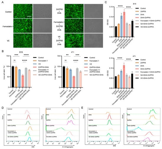 The synergistic anti-cancer effect of ZnPPIX and DHA can be suppressed by antioxidants. (A) Representative fluorescence microscope images of B16 cells treated with various drugs (bar = 125 µm). Ferrostatin-1 and VE both effectively neutralized ZnPPIX + DHA toxicity. Cells were stained with Calcein-AM. Photos were taken under green fluorescence and bright field conditions, respectively. (B) Cytotoxicity analysis of SA, ALA and ZnPPIX as measured by live cell ratios in B16 and 4T1 cells. (C) Detection of lipid peroxidation by MDA assay (Tecan Sunrise at OD532). (D,E) Fluorescence flow cytometry detecting ROS with DHE and JC-10 in B16 and 4T1 cells under different drug treatments. ** p < 0.01, *** p < 0.001, **** p < 0.0001.