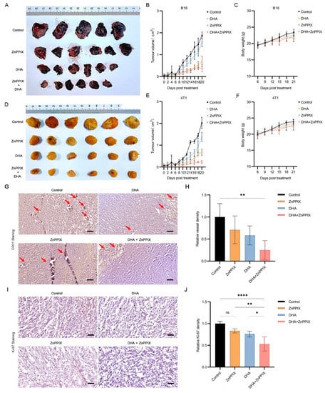 To confirm whether the synergistic anticancer effect of ZnPPIX and DHA exists in vivo, we lastly carried out animal studies using either drug or both to treat tumor model mice. We first established a melanoma B16 mice model. Four-week-old mice were separately injected with ZnPPIX, DHA or both, and tumor sizes were monitored every two days. The mice were sacrificed 25 days later, and tumors were harvested. As shown in Figure 5A, B16 model mice injected with single drugs developed relatively smaller tumors than the control vehicle group, suggesting each drug alone possesses certain anti-tumor abilities. Strikingly, mice injected with both ZnPPIX and DHA formed tumors much reduced in size than those with single applications of each compound, indicating a significantly enhanced anti-tumor effect when the two drugs were combined. A time course measuring the tumor growth was presented in Figure 5B, consistent with the results in Figure 5A. Similar results were independently confirmed with breast cancer 4T1 model mice (Figure 5D,E). Notably, injection of these drugs showed no obvious impact on mice weight gain compared to the control (Figure 5C,F). Further analyses revealed that, compared to tumors from controls, tumors after DHA+ZnPPIX treatment had a trend of decreasing numbers of blood vessels (Figure 5G,H), as marked by CD31, and a lower percentage of proliferating cells, as indicated by reduced Ki-67 expression (Figure 5I,J). This may partially underlie their slower growth [35]. Altogether, these data from animal studies support the combinatory use of ZnPPIX and DHA is significantly more effective in suppressing tumor development in vivo.