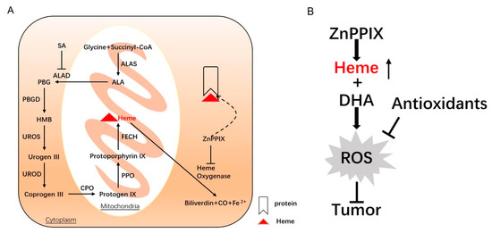 A schematic model illustrating the pathways underlying the synergistic anticancer action of ZnPPIX and DHA. (A) Heme synthesis and degradation. Heme synthesis starts in the mitochondrial matrix with the condensation of succinyl-CoA and glycine by ALAS to generate ALA. ALA leads to the final heme synthesis through a series of reactive processes, wherein ALAD is inhibited by SA. As an inhibitor of heme oxygenase, the heme analog ZnPPIX can reduce the degradation of heme, as well as compete with heme in protein binding, resulting in greatly heightened labile heme levels. (B) DHA-induced ROS generation is enhanced by ZnPPIX via heme elevation. The strengthened anti-cancer activity of DHA activity is mediated by ROS, as it can be counteracted by antioxidants that mitigate ROS accumulation.