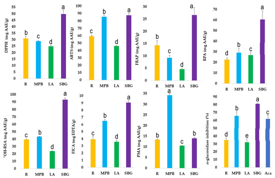 Biological activities (2,2′-diphenyl-1-picrylhydrazyl (DPPH), 2,2′-azinobis-(3-ethylbenzothiazoline-6-sulfonic acid (ABTS), ferric reducing antioxidant power (FRAP), reducing power assay (RPA), hydroxyl-radical scavenging assay (•OH-RSA), ferrous ion chelating assay (FICA), phosphomolybdate assay (PMA)) and α-glucosidase inhibition activity of native Australian rosella (R), mountain pepper berries (MPB), lemon aspen (LA), and strawberry gum (SBG); acarbose (Aca). The vales with letters (a–e) are significantly different from each other.